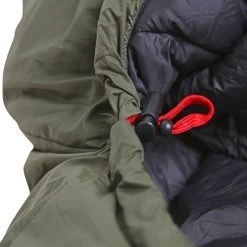 - Den store varmekrave, der effektivt holder varmen inde i soveposen. Varmekraven har elastisk snøring, så du kan trække den tæt om skuldrene, uden at det bliver ubehageligt stramt.